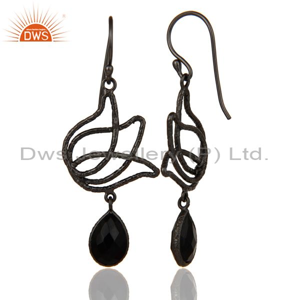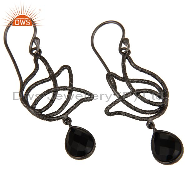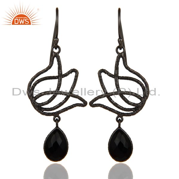 Black Oxidized 925 Sterling Silver Lotus Design Natural Black Onyx Drop Earrings