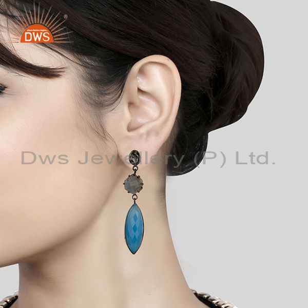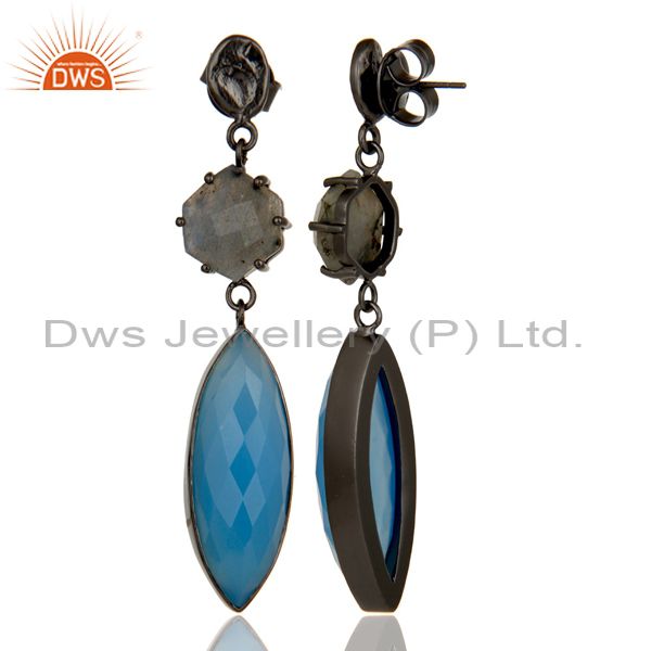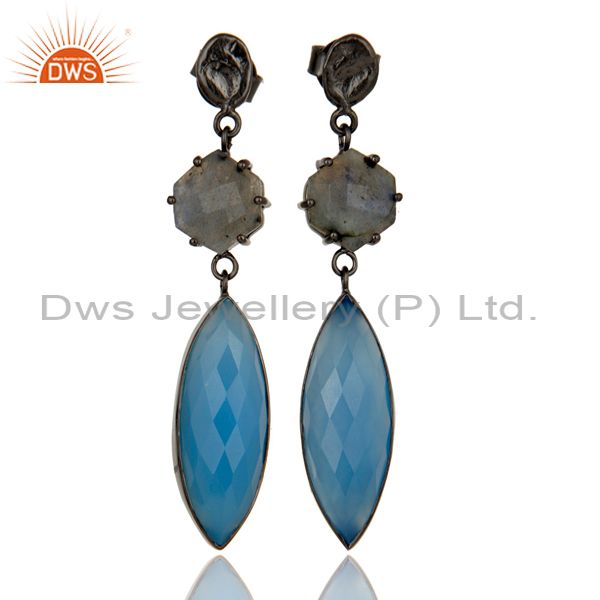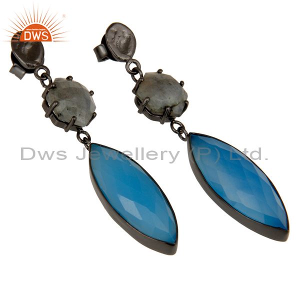 Black Oxidized Brass Dangle Earrings With Natural Labradorite & Blue Chlacedony
