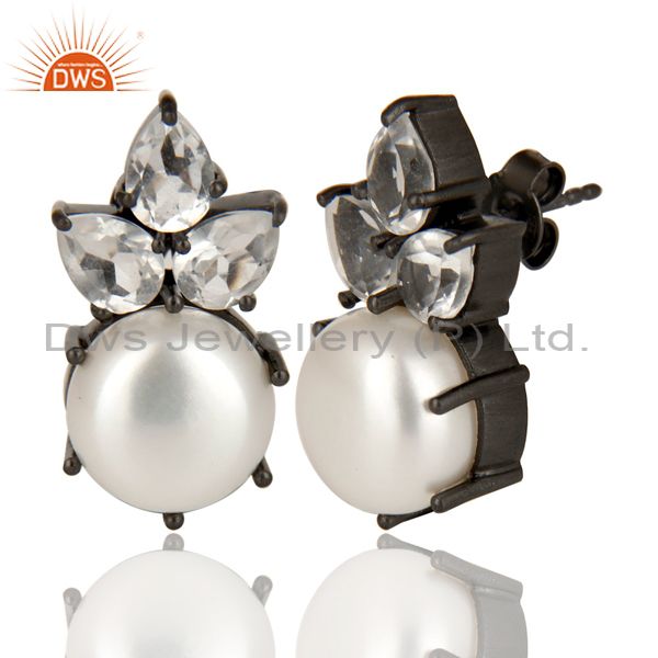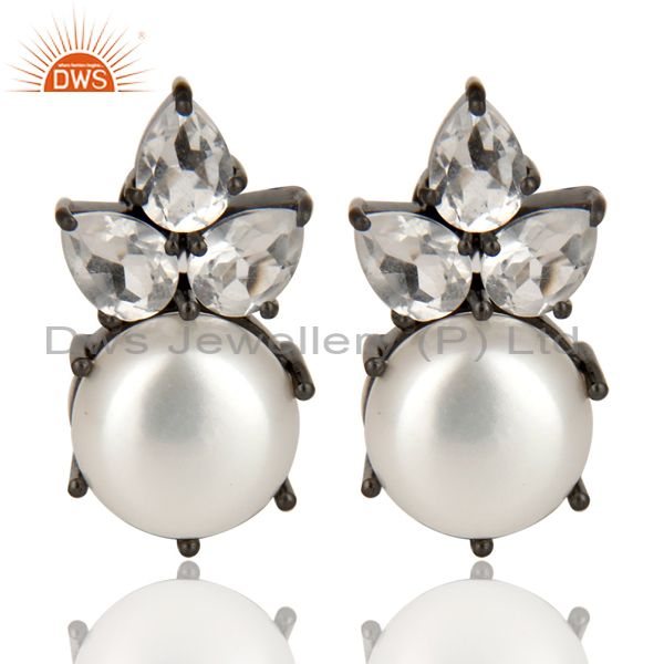 Black Oxidized Sterling Silver Crystal Quartz & Pearl Prong Set Studs Earrings