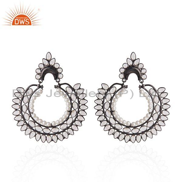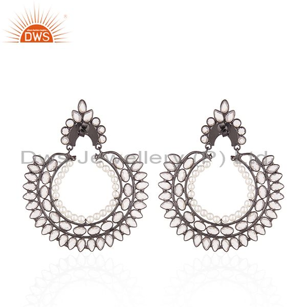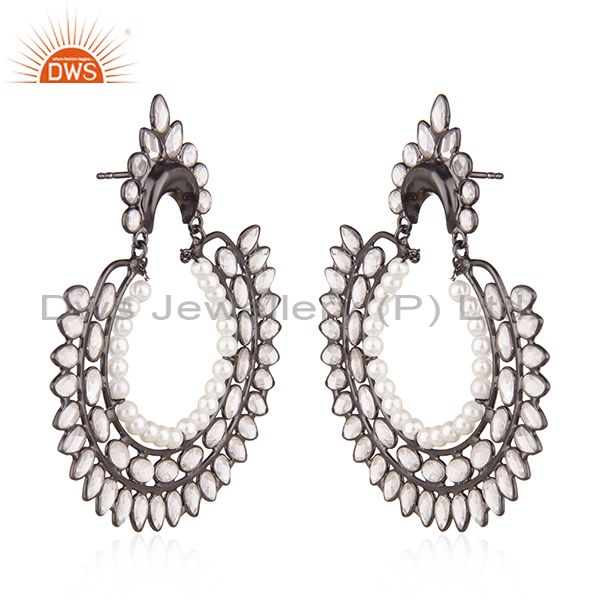 Black Rhodium Plated 925 Silver Zircon And Pearl Earrings For Womens
