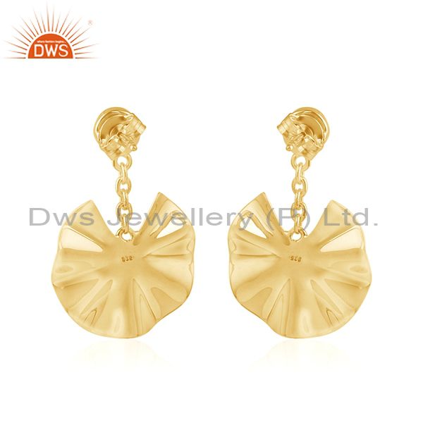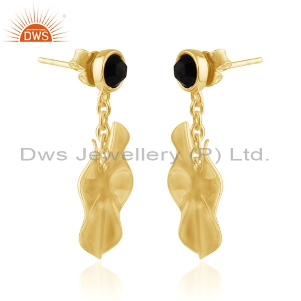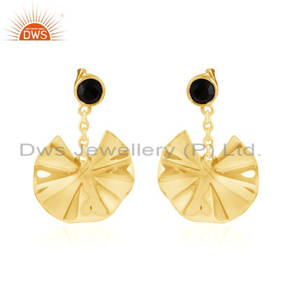 Blck Onyx Gold Plated Silver Wavy Disc Design Dangle Earrings Jewelry