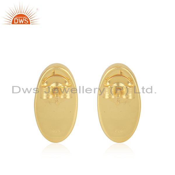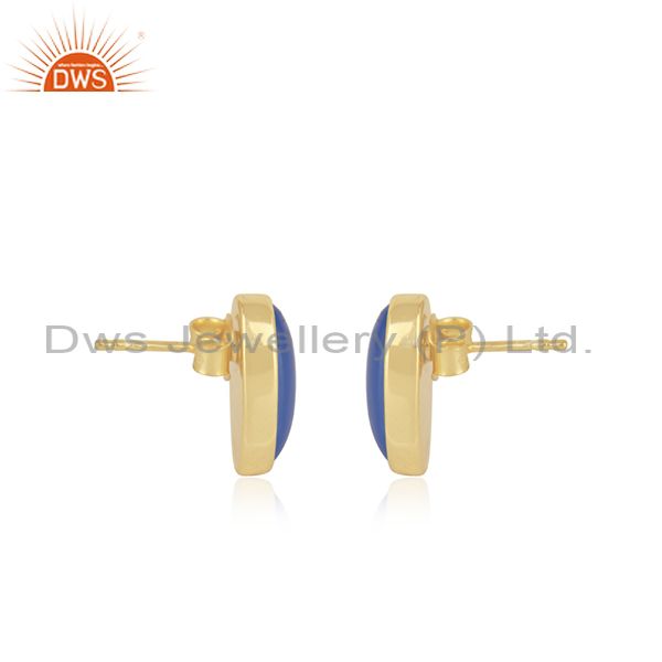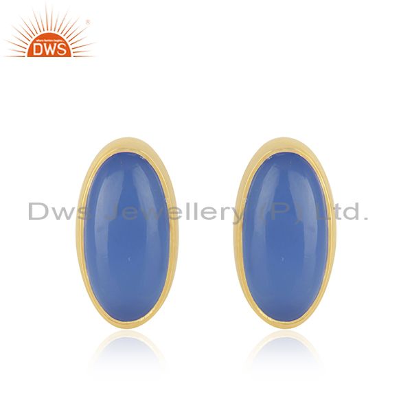 Blue Chalcedony Gemstone Gold Plated Silver Oval Shape Stud Earrings