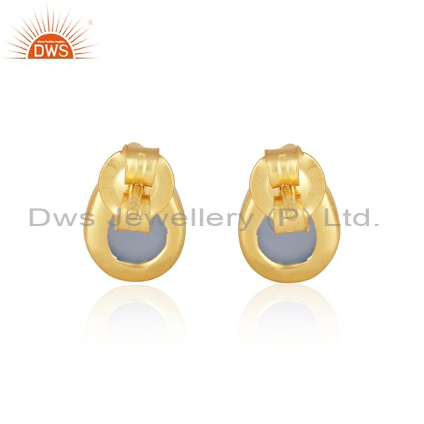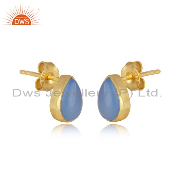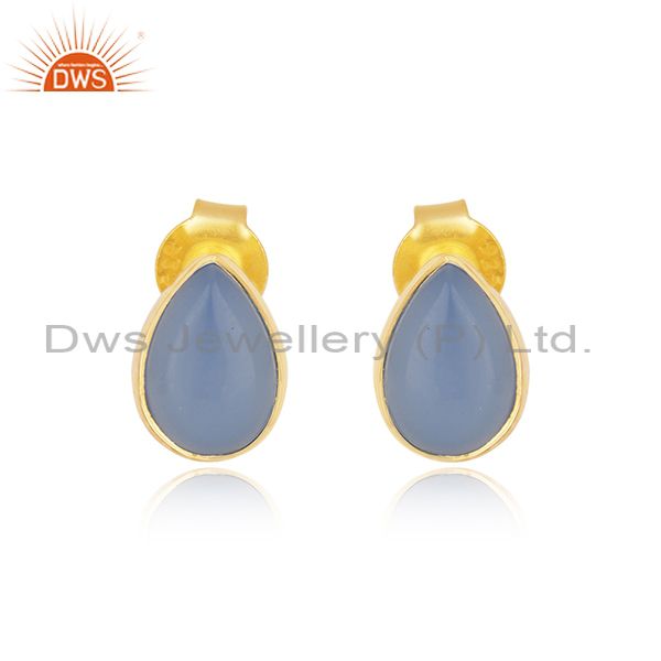 Blue Chalcedony Gemstone Gold Plated Sterling Silver Stud Earrings