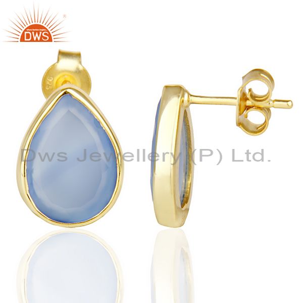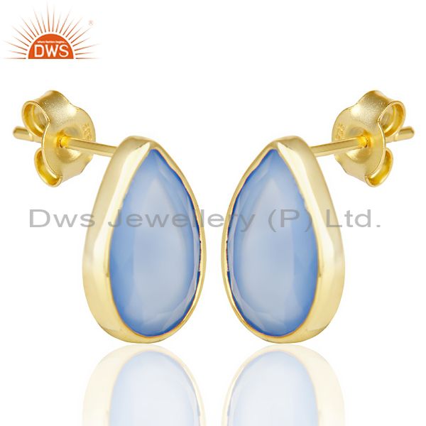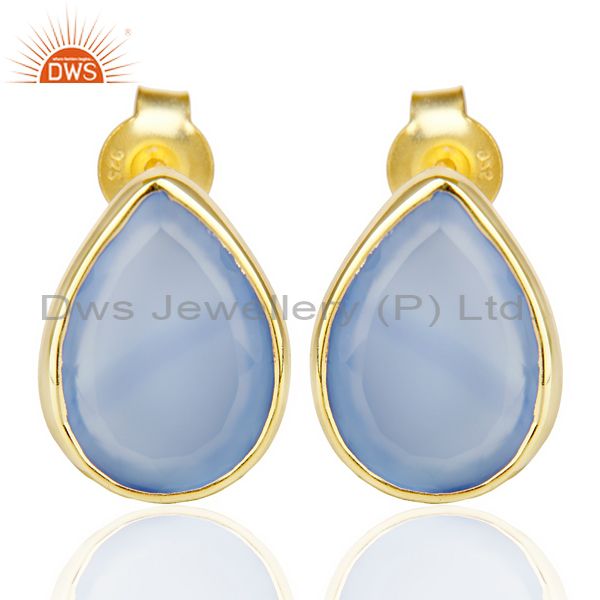 Blue Chalcedony Pear Shape Flat Back Gold Plated Stud Earring In Silver