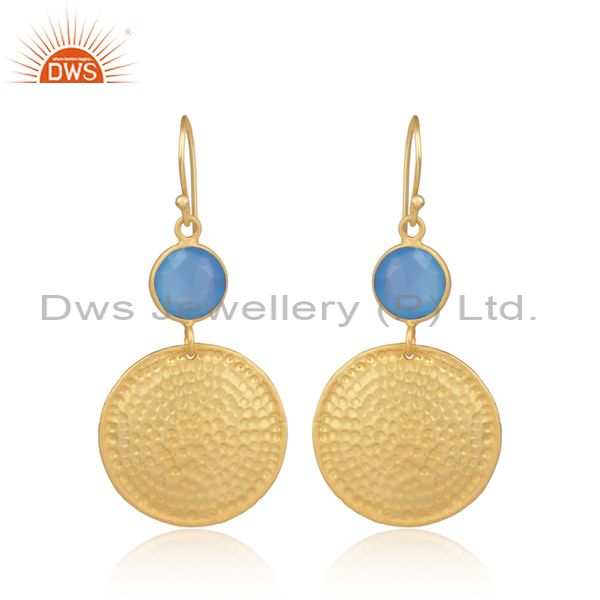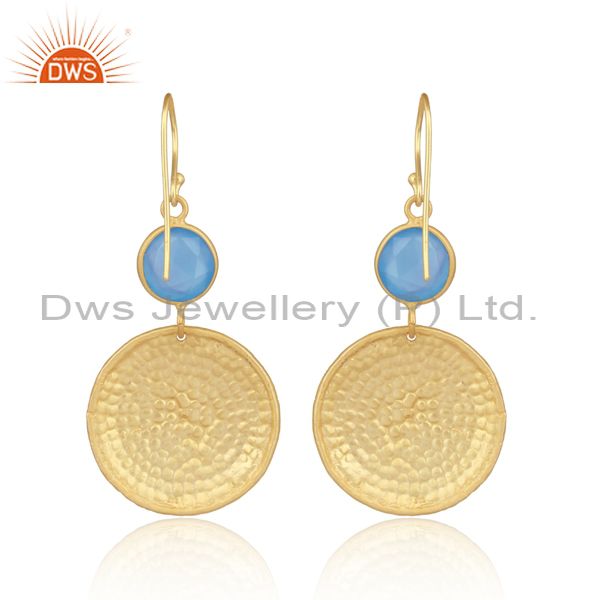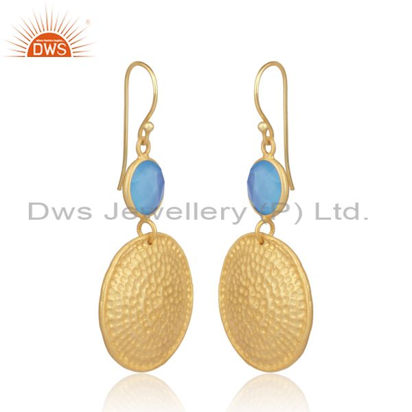Blue Chalcedony Set Gold On Silver Round Ear Wire Earrings
