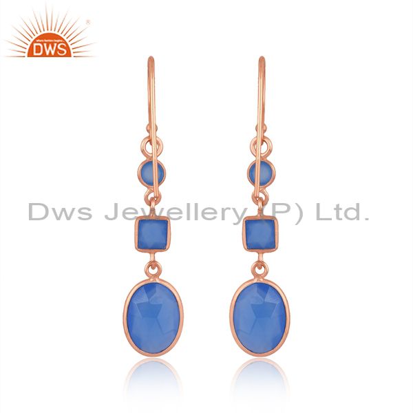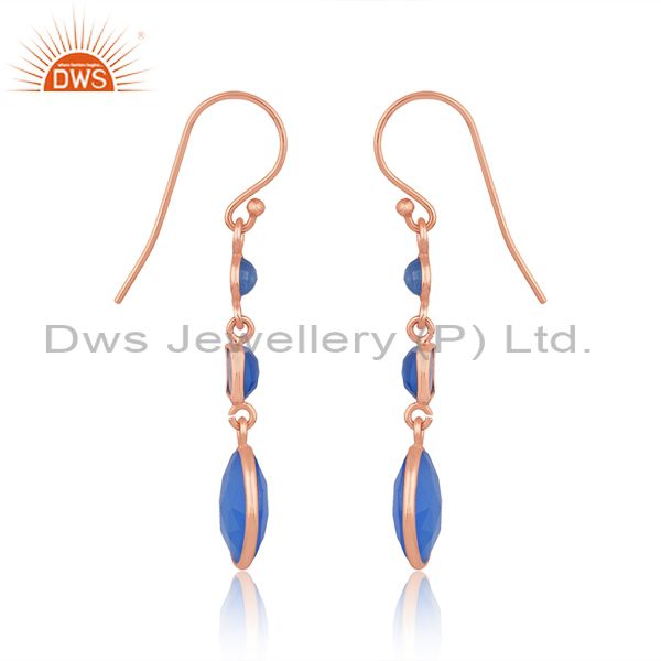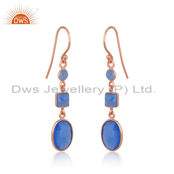 Blue Chalcedony Set Rose Gold On Silver Long Fancy Earrings