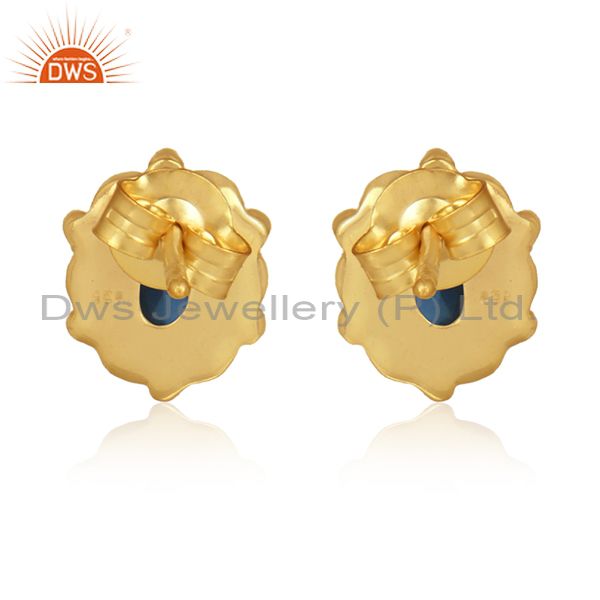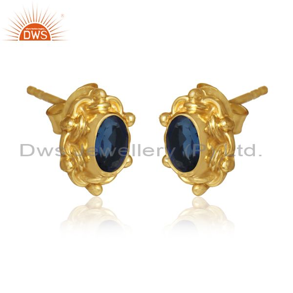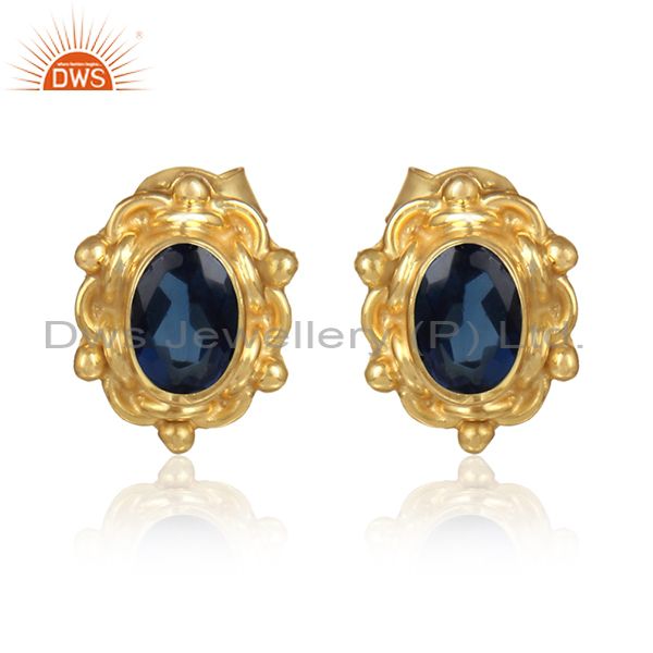 Blue Corundum Gemstone Designer Gold Plated Silver Stud Earrings