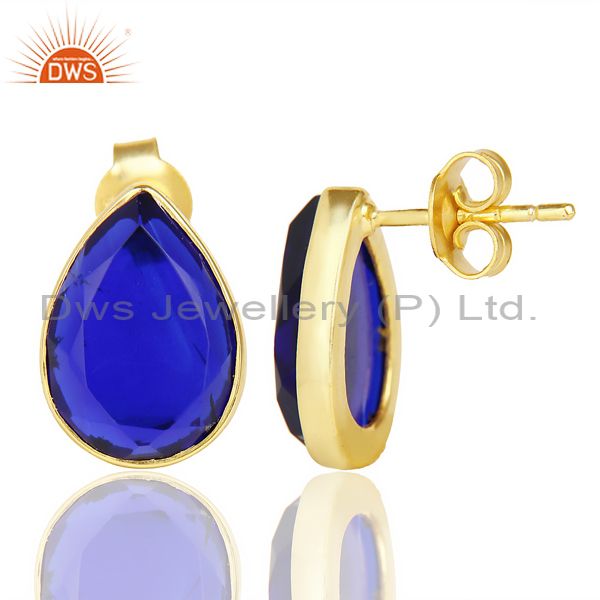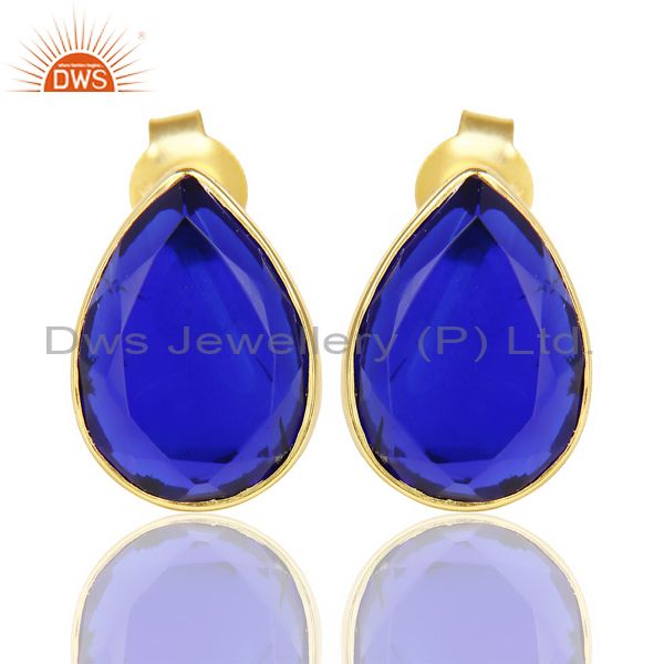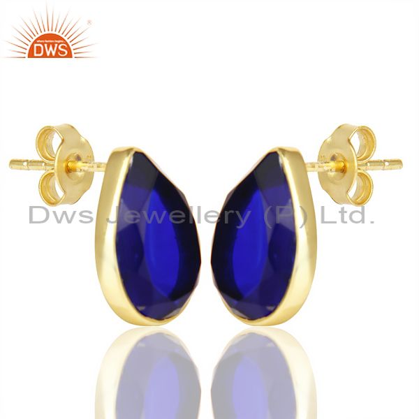 Blue Corundum Pear Shape Flat Back Stud 14K Gold Plated 92.5 Silver Earring
