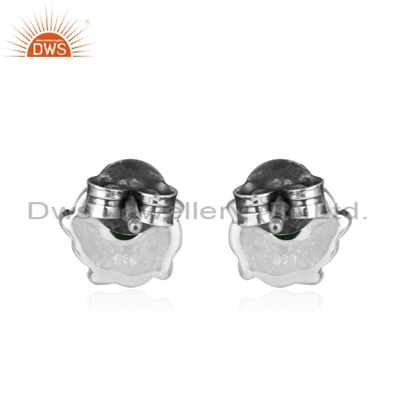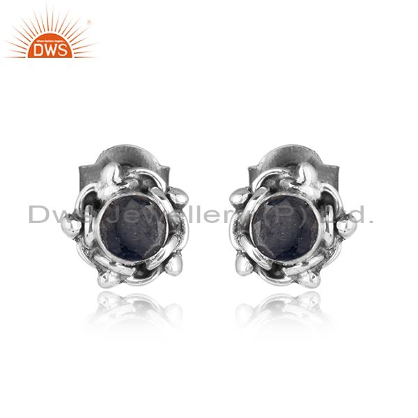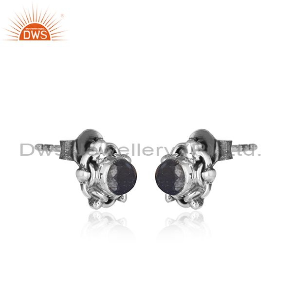 Blue Sapphire Gemstone Tiny Oxidized Sterling Silver Stud Earring