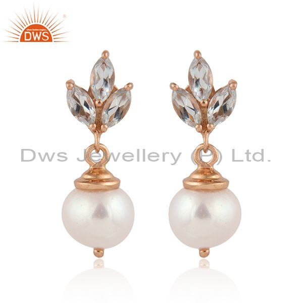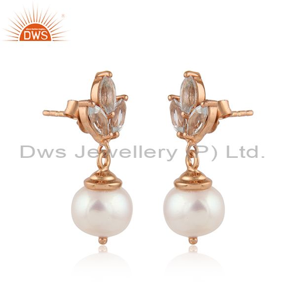 Blue Topaz Pearl Designer Rose Gold Plated Silver Drop Earring