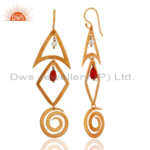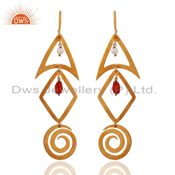 Brushed 18Kt Gold-Plated Sterling Silver Stone Carnelain & Pearl Dangle Earrings
