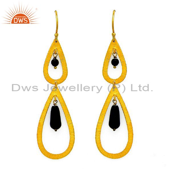 Brushed 22K Gold Plated Sterling Silver Black Onyx Gemstone Teardrop Earrings