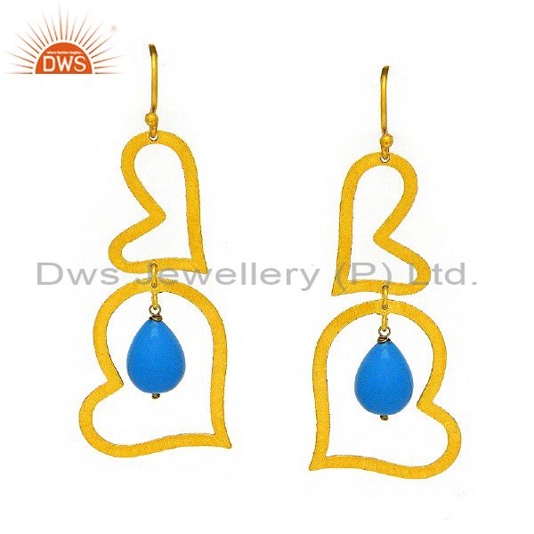 Brushed 22K Gold Plated Sterling Silver Turquoise Heart Designer Dangle Earrings