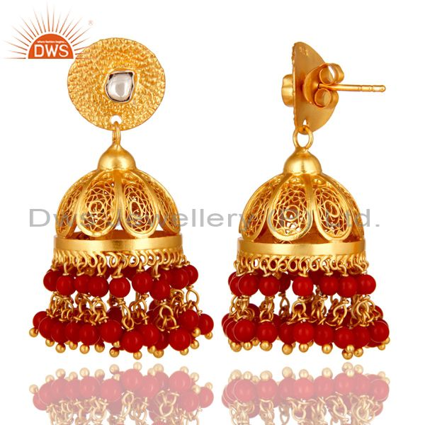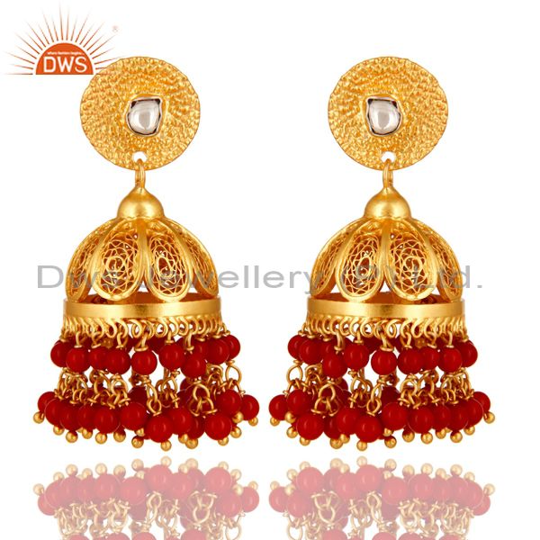 Coral Gemstone Event Wear Chandelier Earrings Made 14K Gold Over Sterling Silver