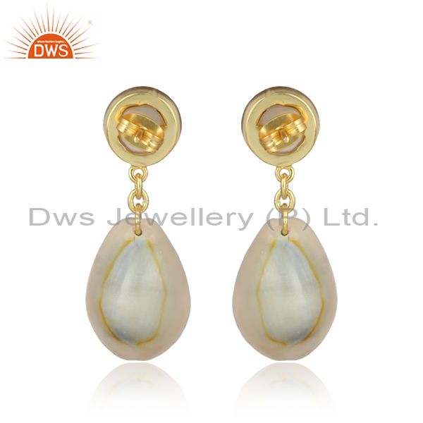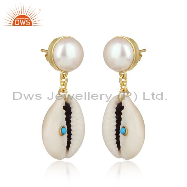 Cowrie, Pearl And Turquoise Brass Tear Shaped Earrings