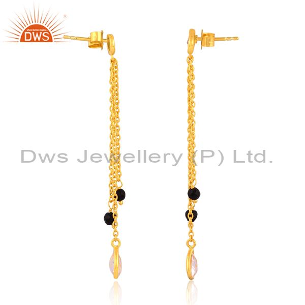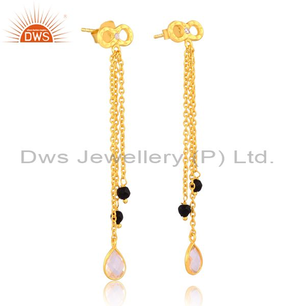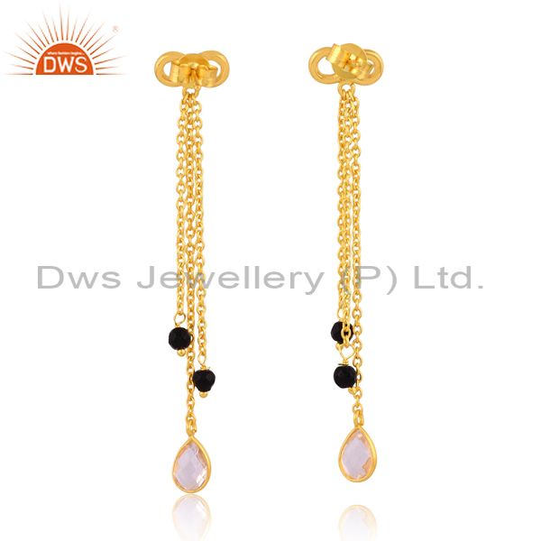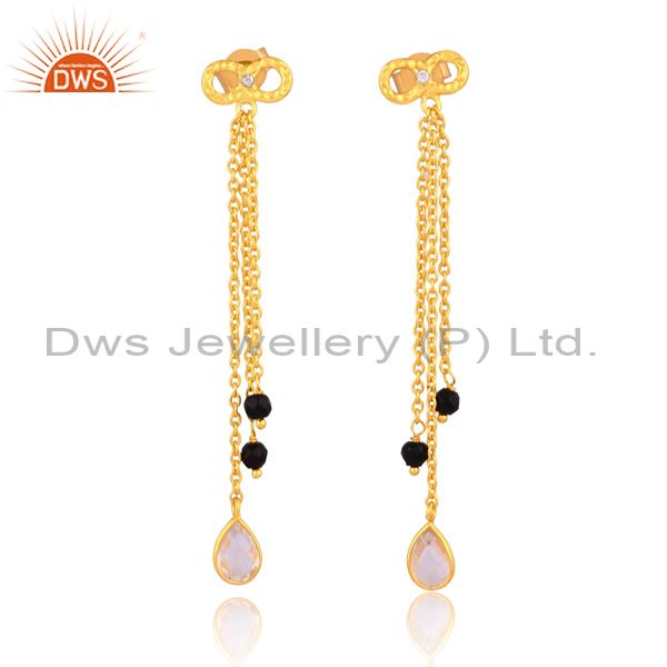 Crystal Quartz, Black Onyx, Zirconia Silver Gold Earrings