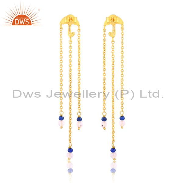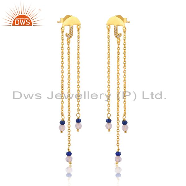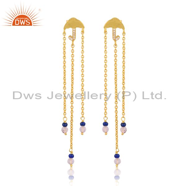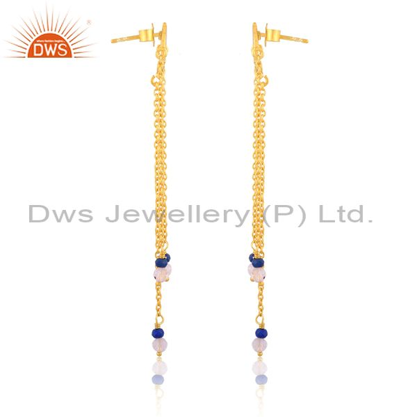 Crystal Quartz, Lapis, Zirconia On Gold Silver Earring