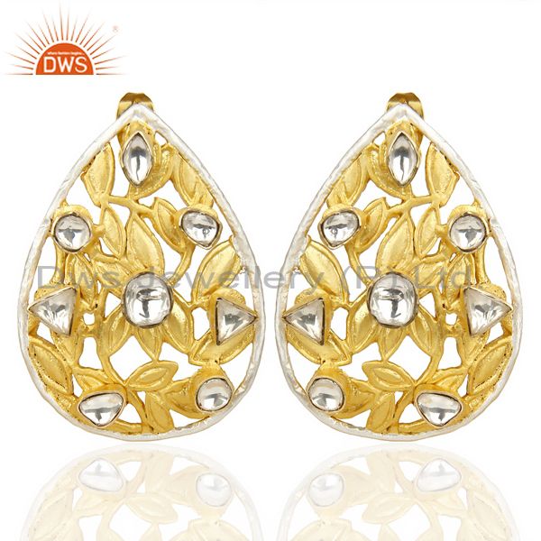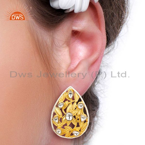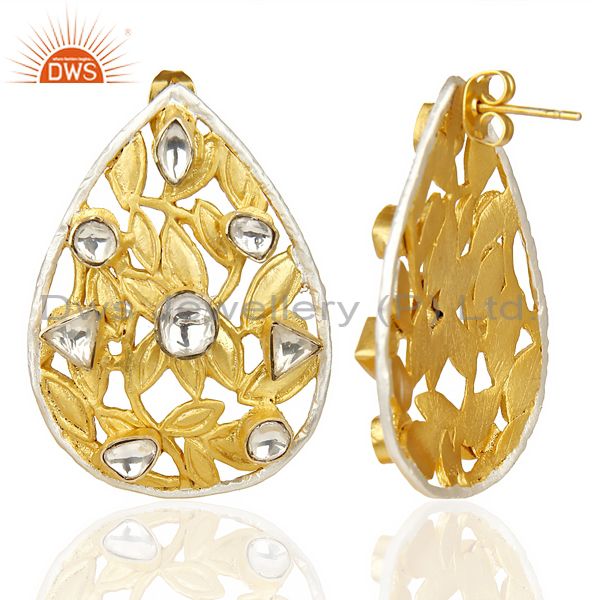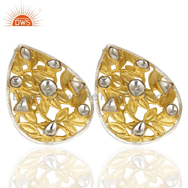 Crystal Quartz Stud 14K Yellow Gold Plated Polki Brass Earrings Jewelry
