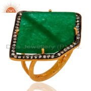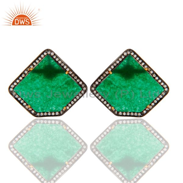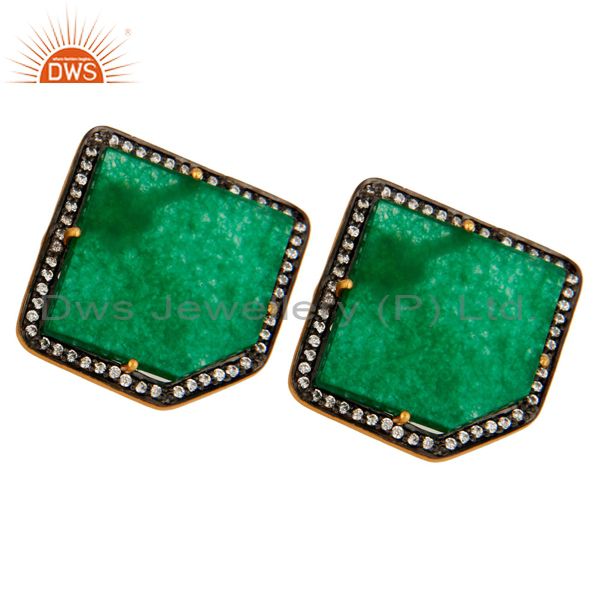 CZ & Slice Cut Green Aventurine Gemstone Stud Earrings In 18K Gold On Silver
