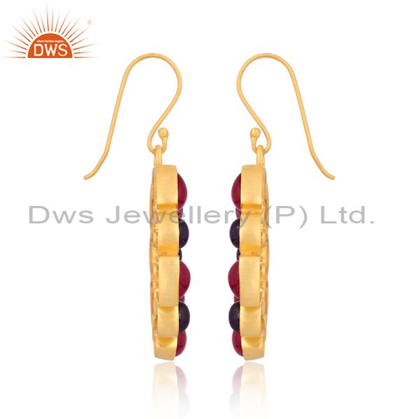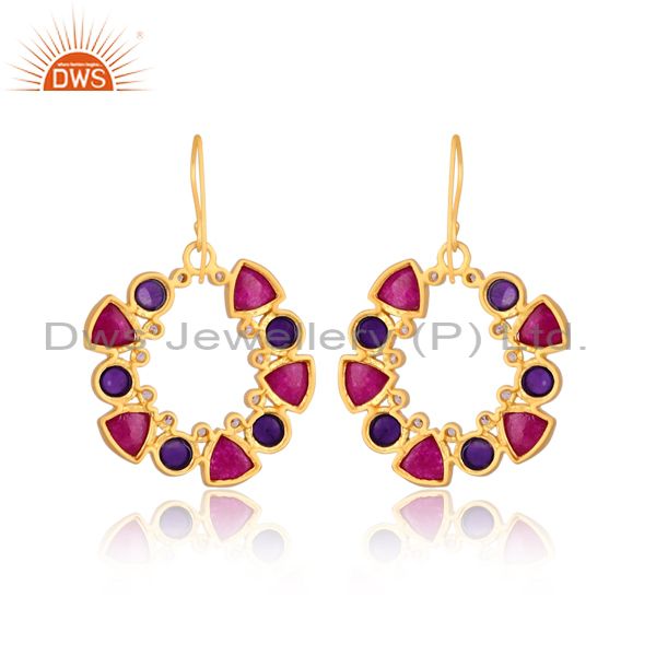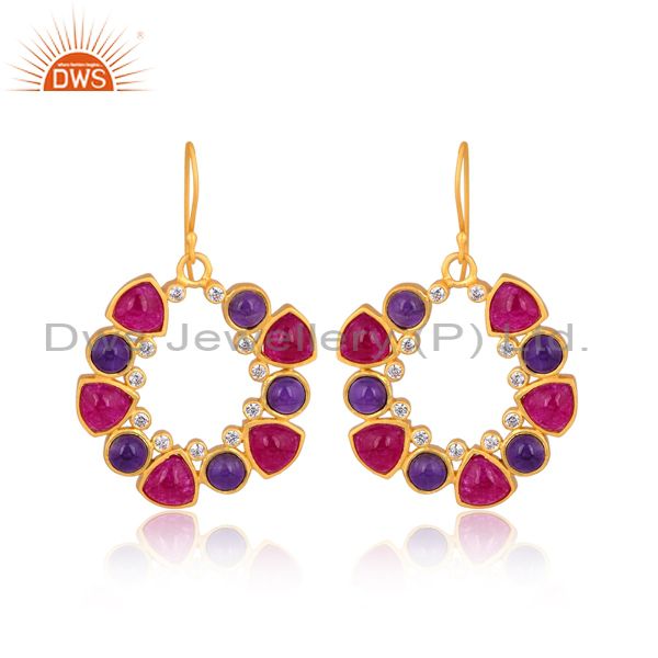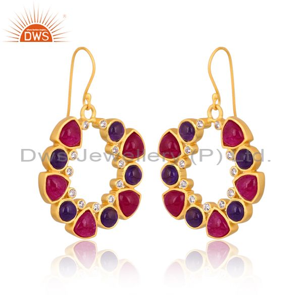 Cz, Amethyst, And Red Quartz Set Fancy Brass Gold Earrings