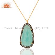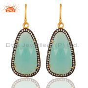 CZ And Aqua Glass Chalcedony Women Studs Earrings In 14K Gold Over 925 Silver