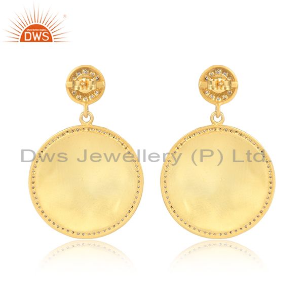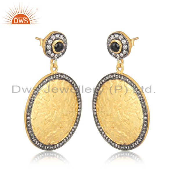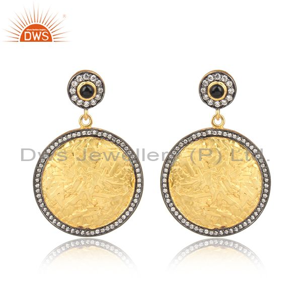 Cz And Black Onyx Gold On 925 Silver Hammered Coin Earrings