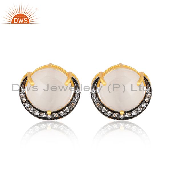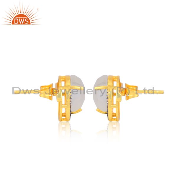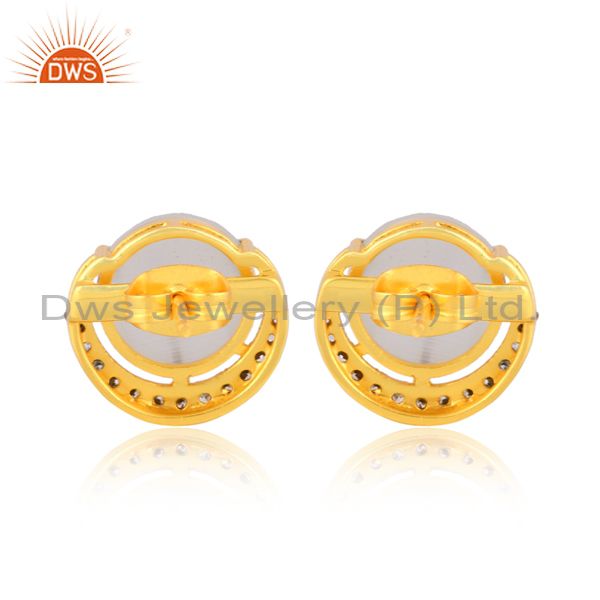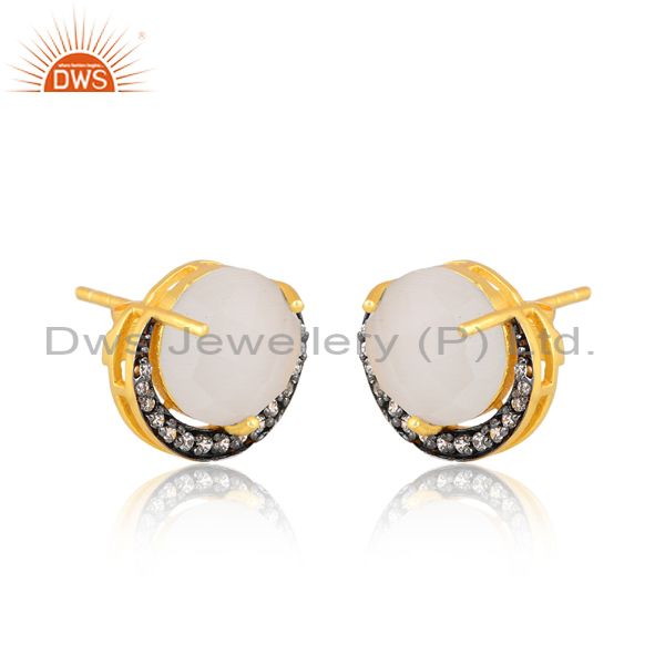 CZ And White Moon Stone Set Gold On Fine 925 Silver Earrings