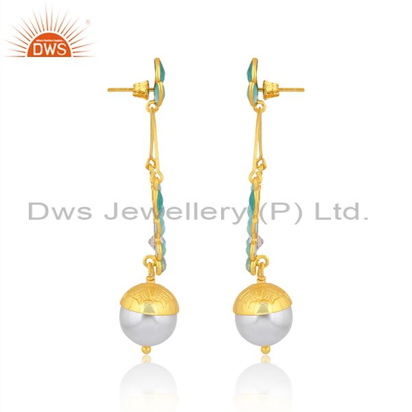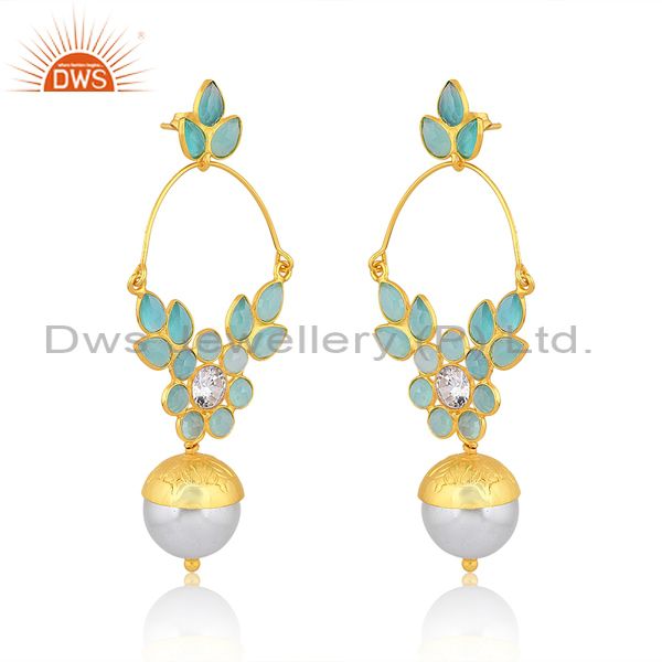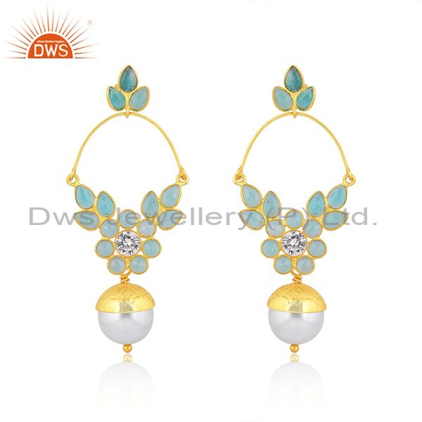 Cz, Aqua Chalcedony, Pearl Set Brass Gold Designer Earrings
