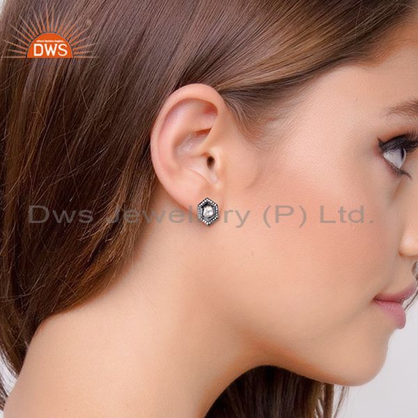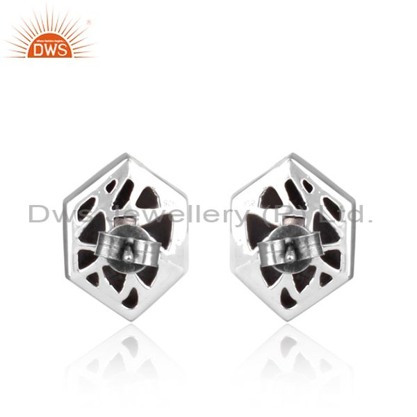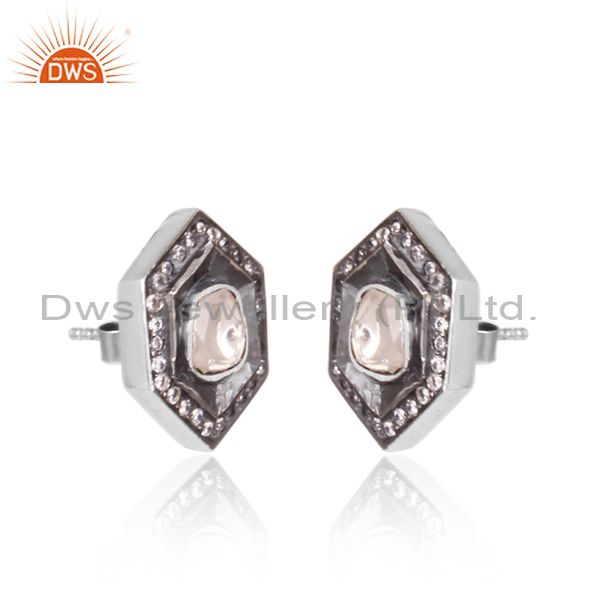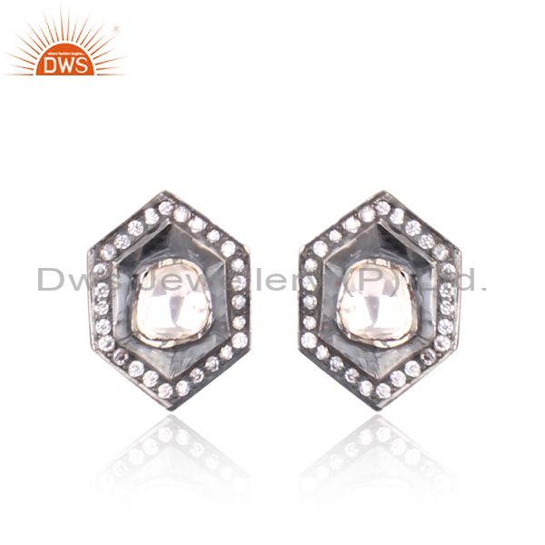 CZ, Crystal Quartz Hexagon Shaped Oxidized Silver Earrings