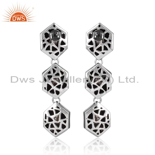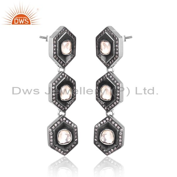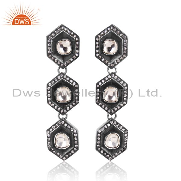 CZ, Crystal Quartz Set Hexagon Cut Oxidized Silver Earrings