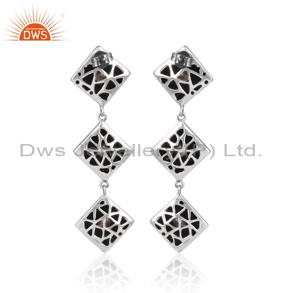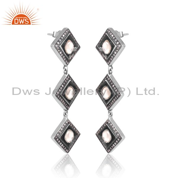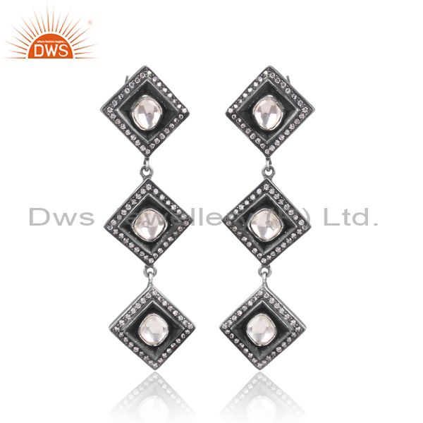 CZ, Crystal Quartz Set Oxidized 925 Silver Long Earrings