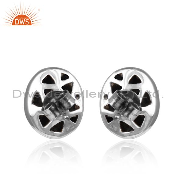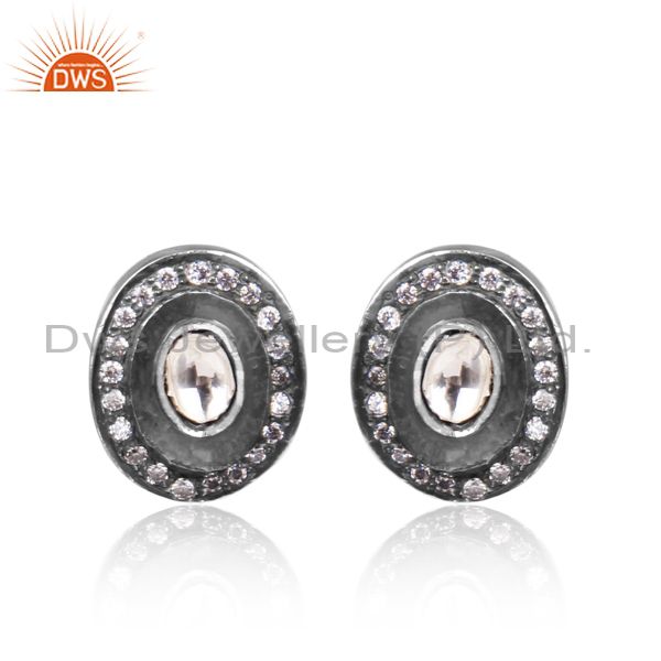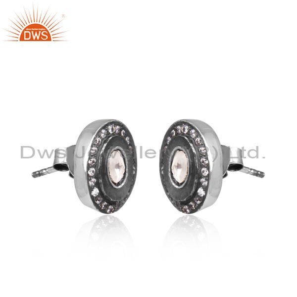 CZ, Crystal Quartz Set Oxidized Silver Oval Shaped Earrings