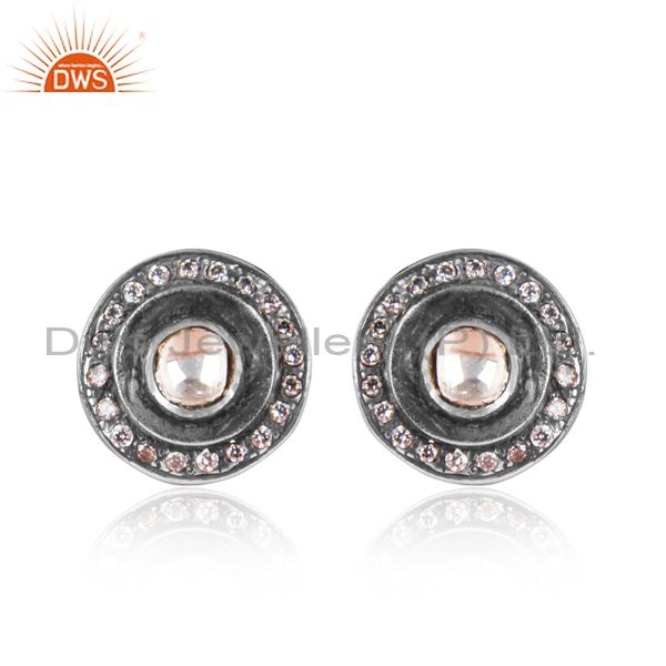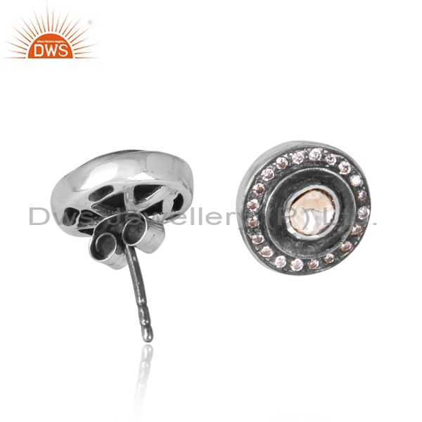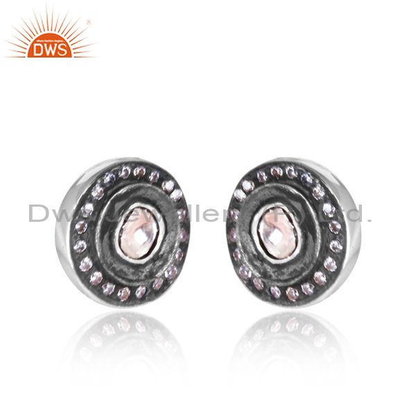 CZ, Crystal Quartz Set Oxidized Silver Round Shaped Earrings