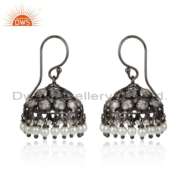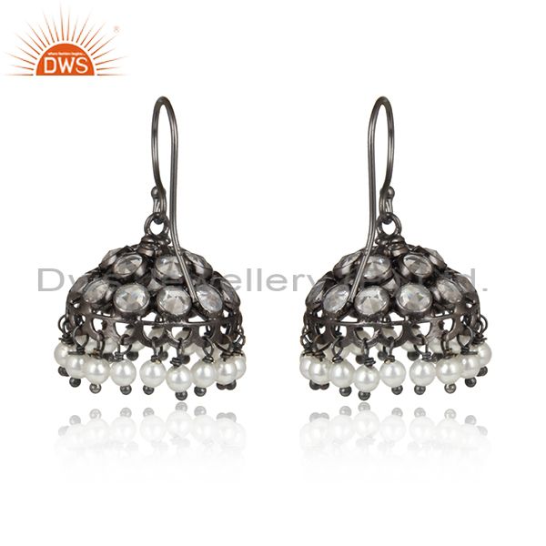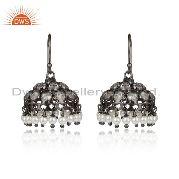CZ Natural Pearl Gemstone Oxidized 925 Silver Designer Earrings