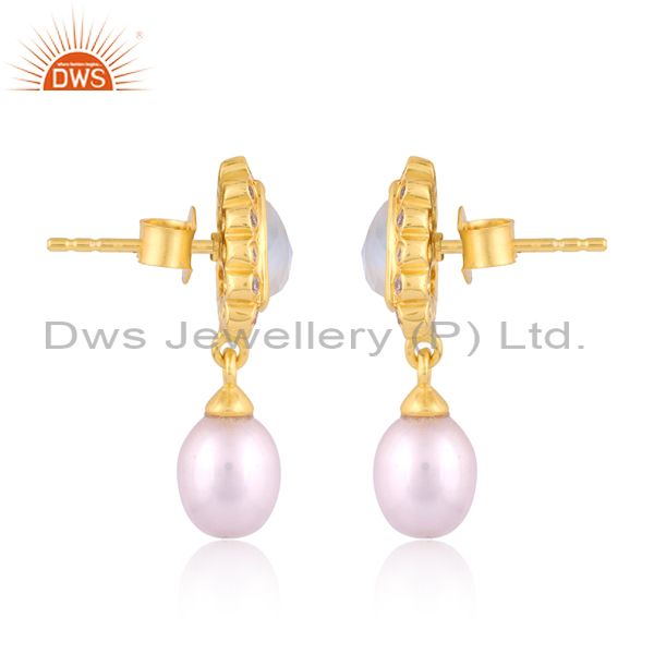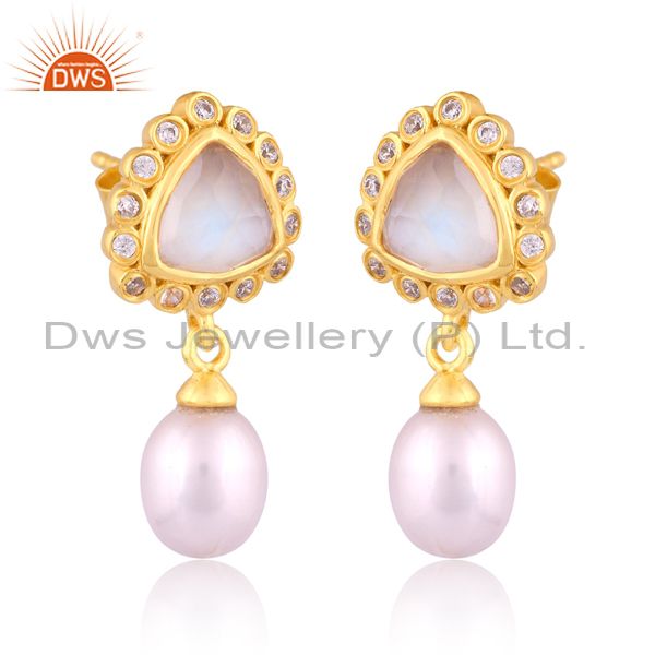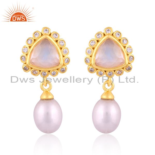 Cz, Rainbow Moon Stone, Pearl 18K Gold On Silver Earrings