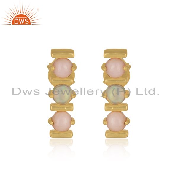 Dainty Yellow Gold on Silver Bars Earring with Pink and Ethiopian Opal