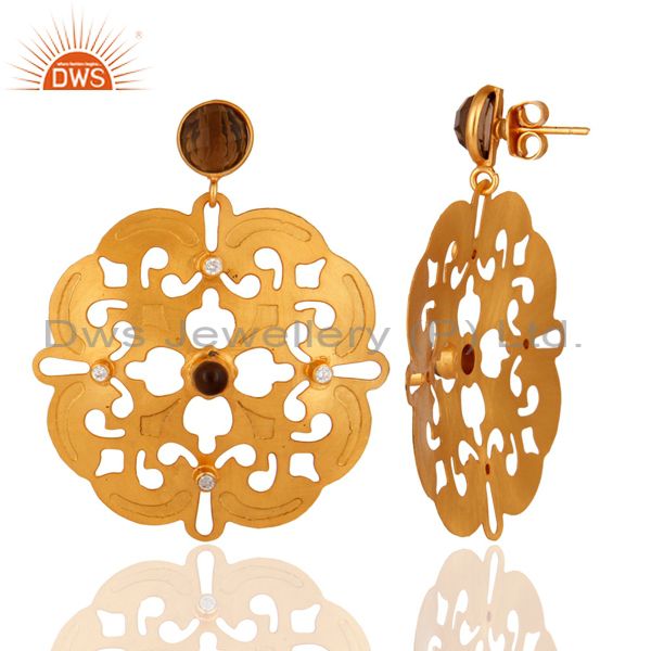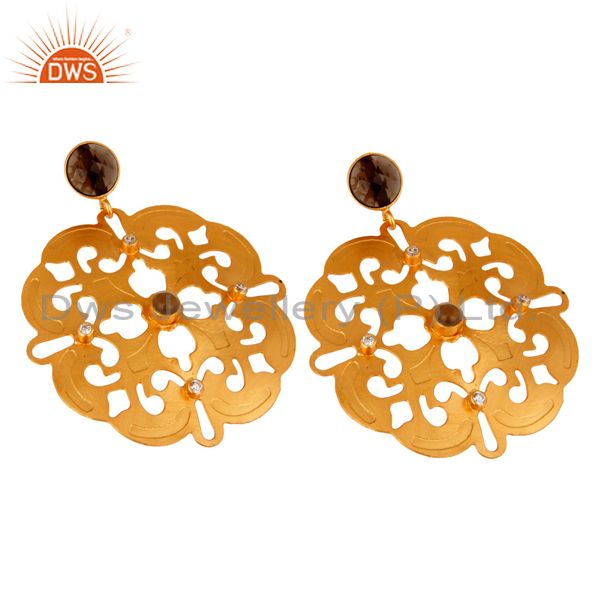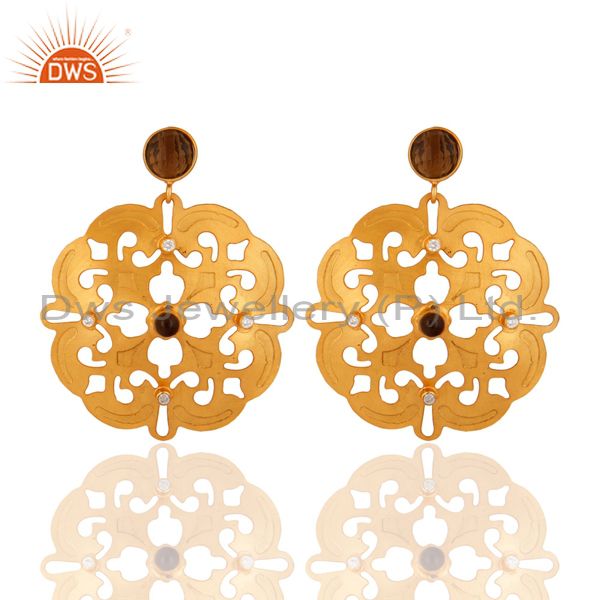 Desginer Smoky Quartz Earrings With Zircon Made On 18K Gold Over Brass Jewelry
