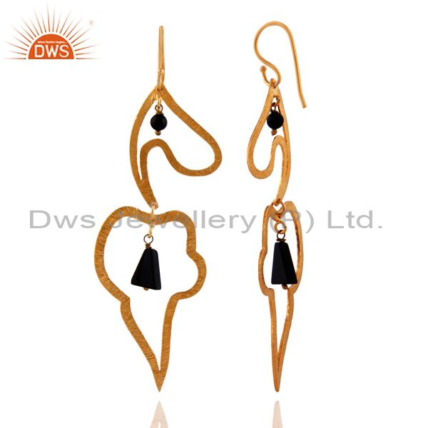 Designer 925 Sterling Silver Black Onyx 18K Gold Plated Brushed Hook Earrings