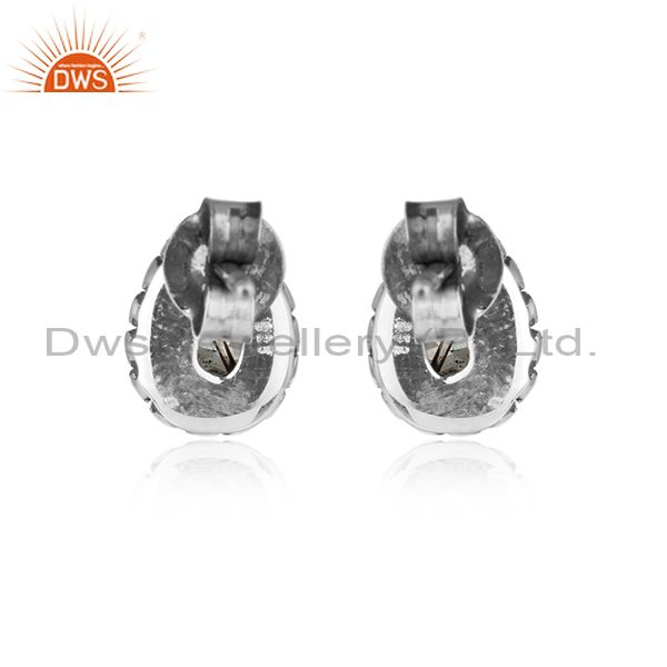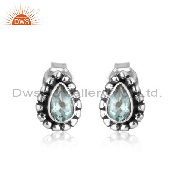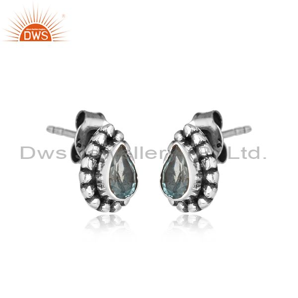 Designer Blue Topaz Gemstone Handmade Oxidized Silver Stud Earrings