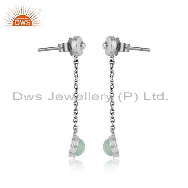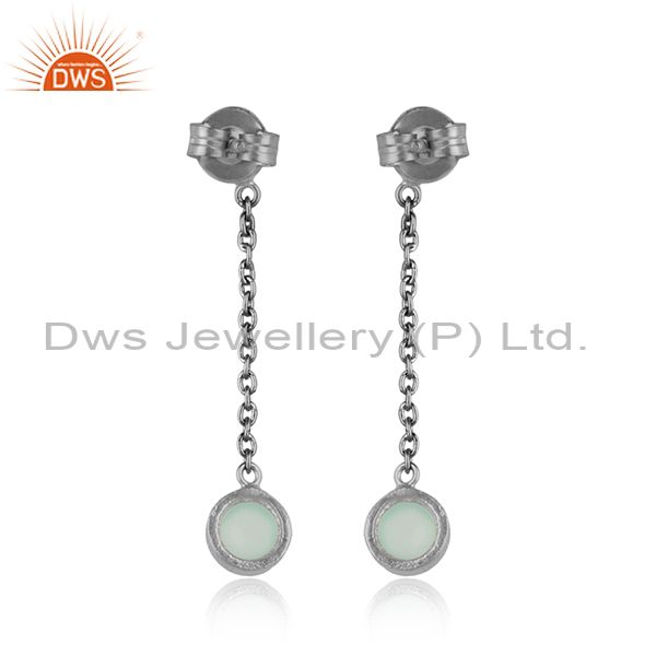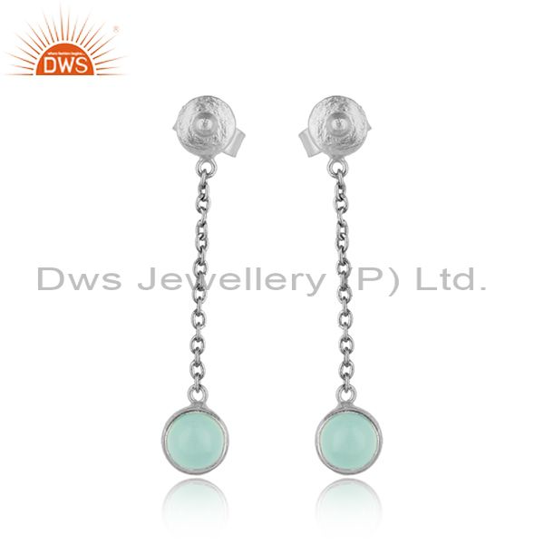 Designer Chain Dangle Aqua Chalcedony Earring In Oxidized Silver 925