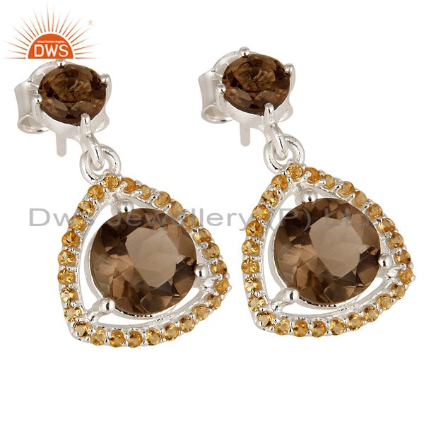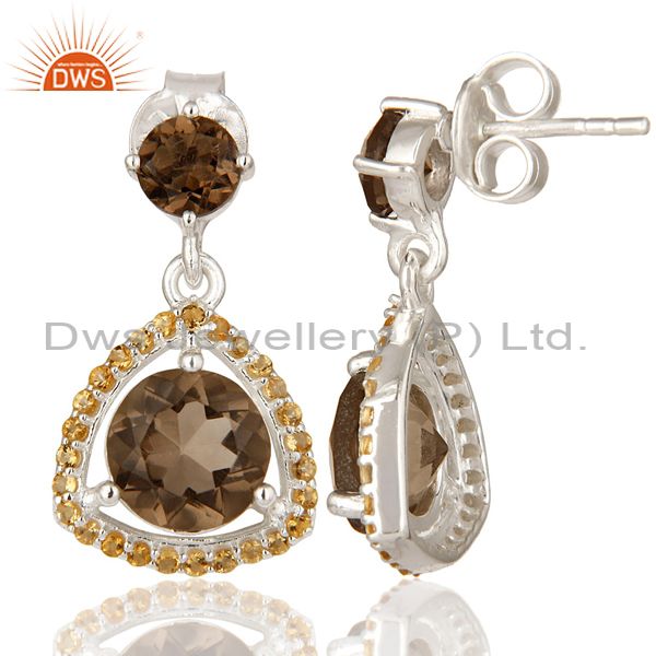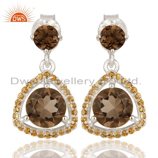 Designer Citrine And Smoky Quartz Gemstone Dangle Earrings In Sterling Silver