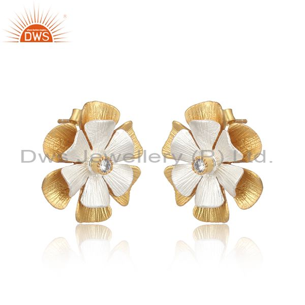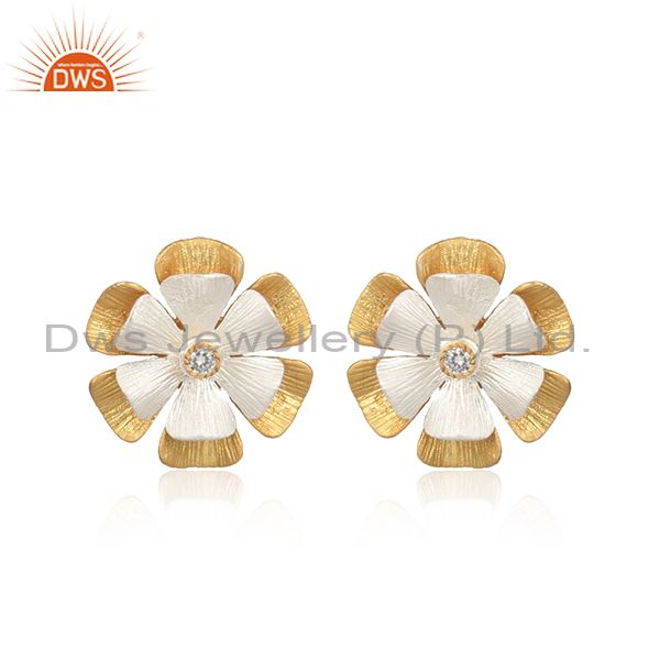 Designer Cz Gold & White On Silver Petal Cut Floral Earring