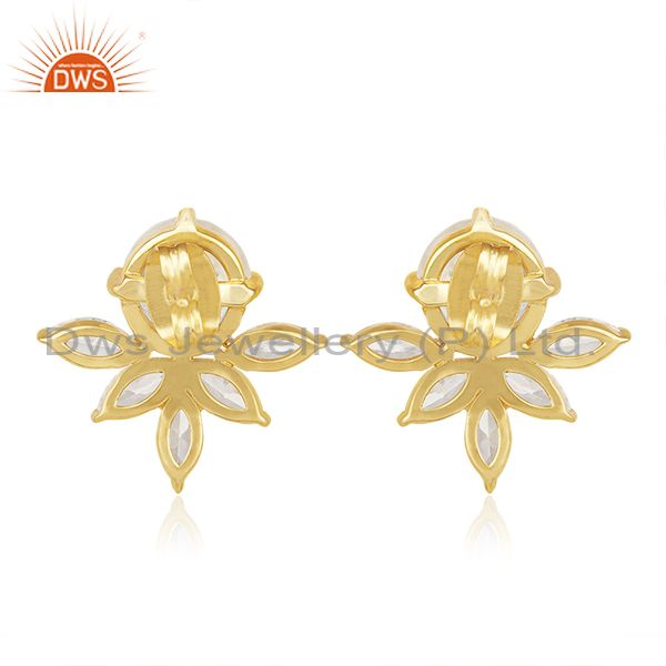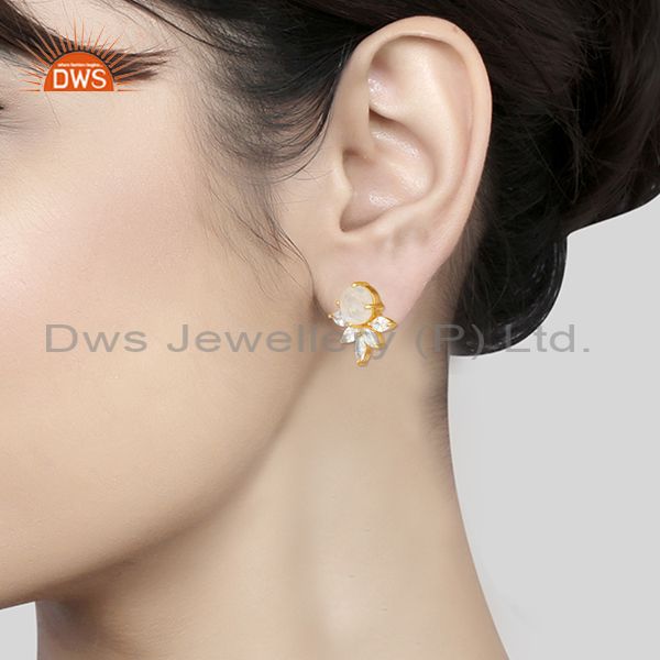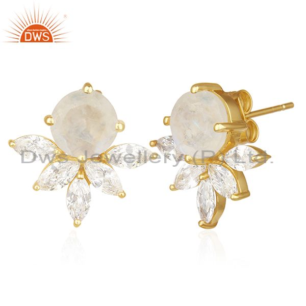 Designer Gold Plated Brass Prong Set Moonstone And Zircon Stud Earring Wholesale