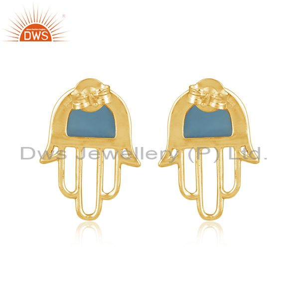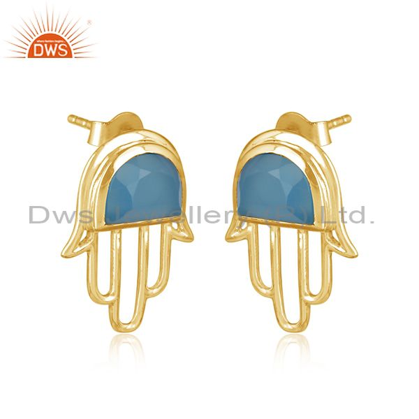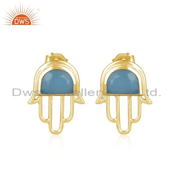 Designer Hamsa Hand Gold on Silver Studs 925 with Blue Chalcedony