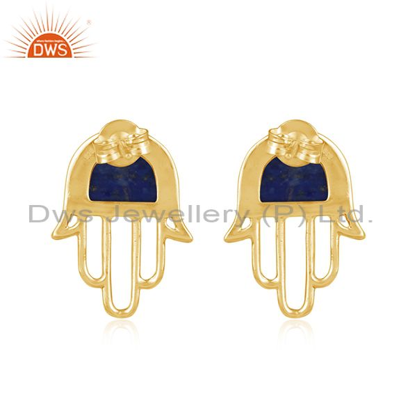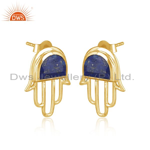 Designer Hamsa Hand Gold On Silver Studs 925 With Lapis