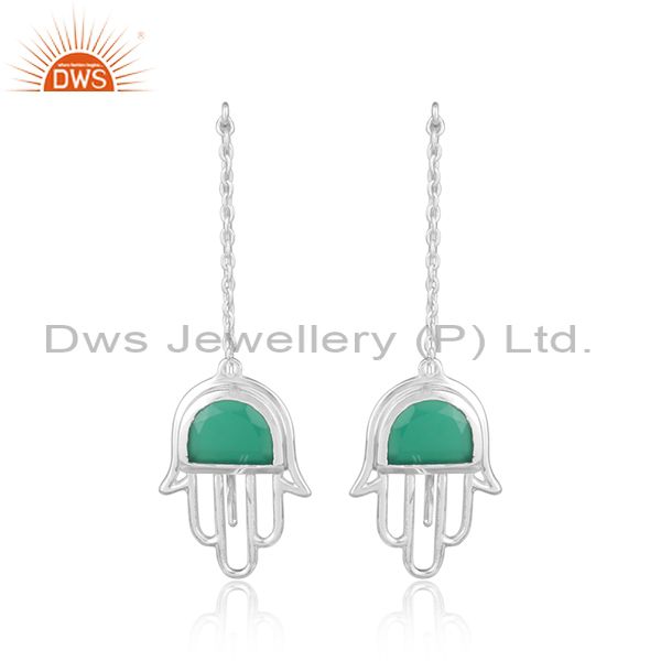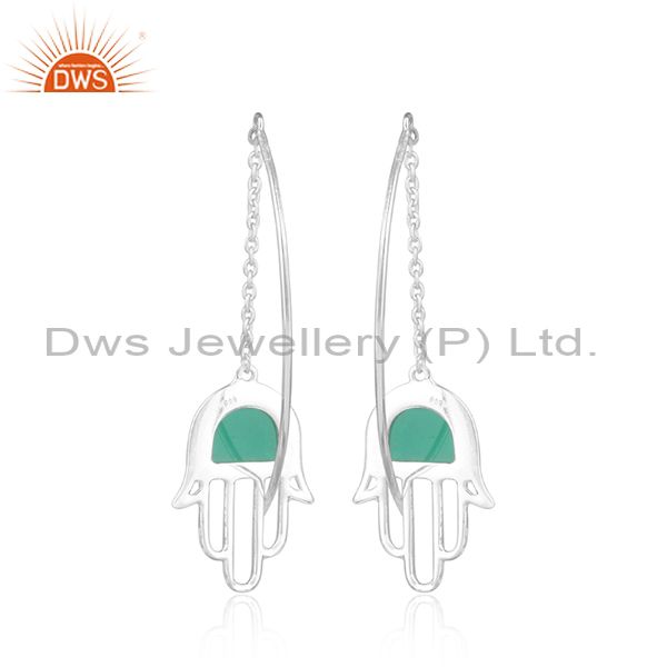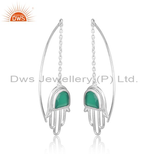 Designer Hamsa Hand Silver Long Dangle with Green Onyx
