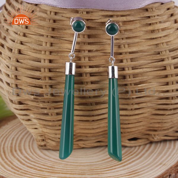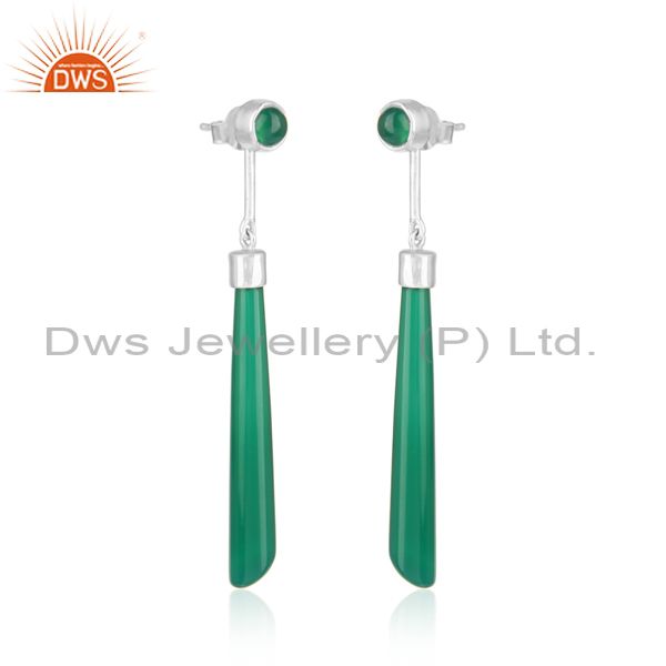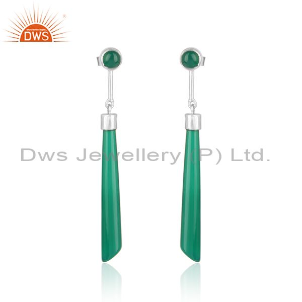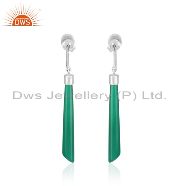 Designer Long Earring In Rhodium On Silver 925 And Green Onyx