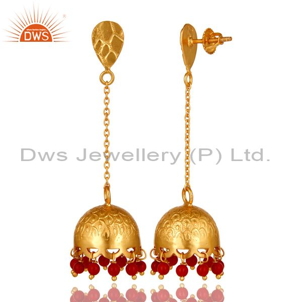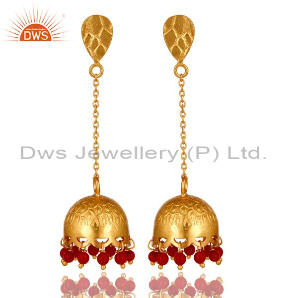 Designer Red Coral Gemstone 22K Gold Over 925 Silver Indian Style Jhumka Earring