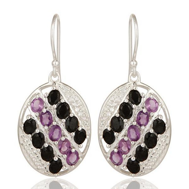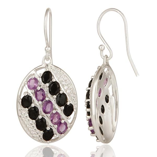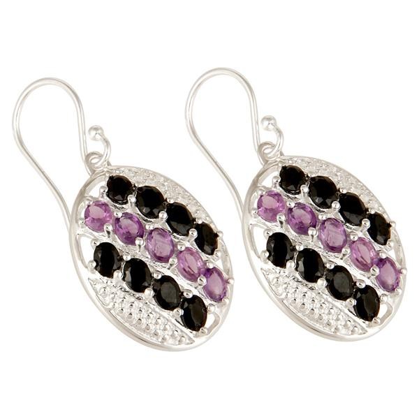 Designer Sterling Silver Amethyst, Black Onyx And White Topaz Dangle Earrings