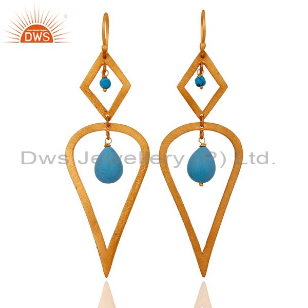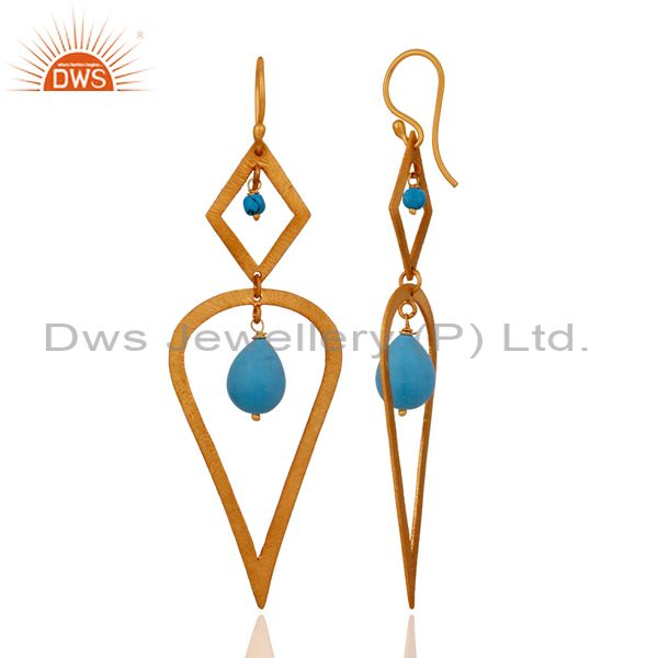 Designer Turquoise Gemstone 925 Sterling Silver 22K Gold Plated Dangle Earrings